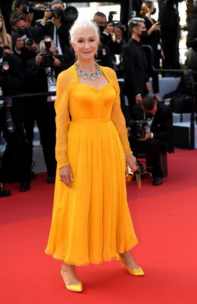 Mirren drapes herself in a bright yellow long-sleeve dress by Dolce & Gabbana.