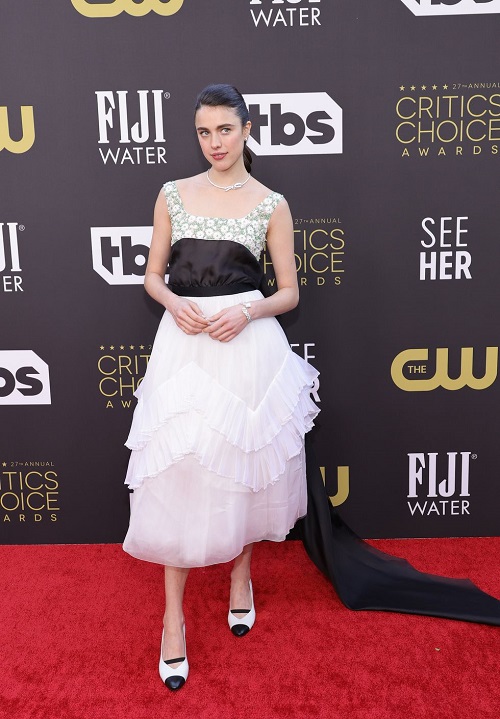 Qualley is wearing Chanel Couture.