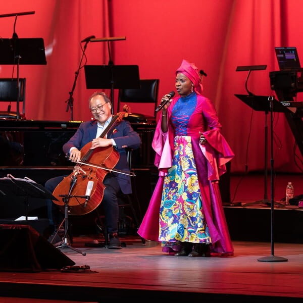 Angelique Kidjo performing alongside Yo-yo Ma at the Sarabande Africaine, in a culturally rich ensemble.