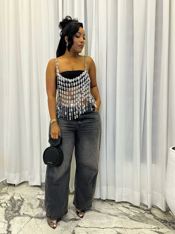 Joselyn Dumas opted for a silver sequin chainmail-style cami layered over a black bandeau, paired with wide-legged charcoal jeans. She completed the look with a sleek black circular top-handle bag and metallic open-toe heels